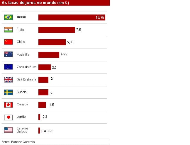 Resumindo, o Brasil tinha quase o dobro do juro da Índia no mesmo período! É muita coisa. Nos outros países mais desenvolvidos, como o Japão Estados Unidos, e a região da União Europeia as taxas de juro são bem inferiores as tupiniquins.